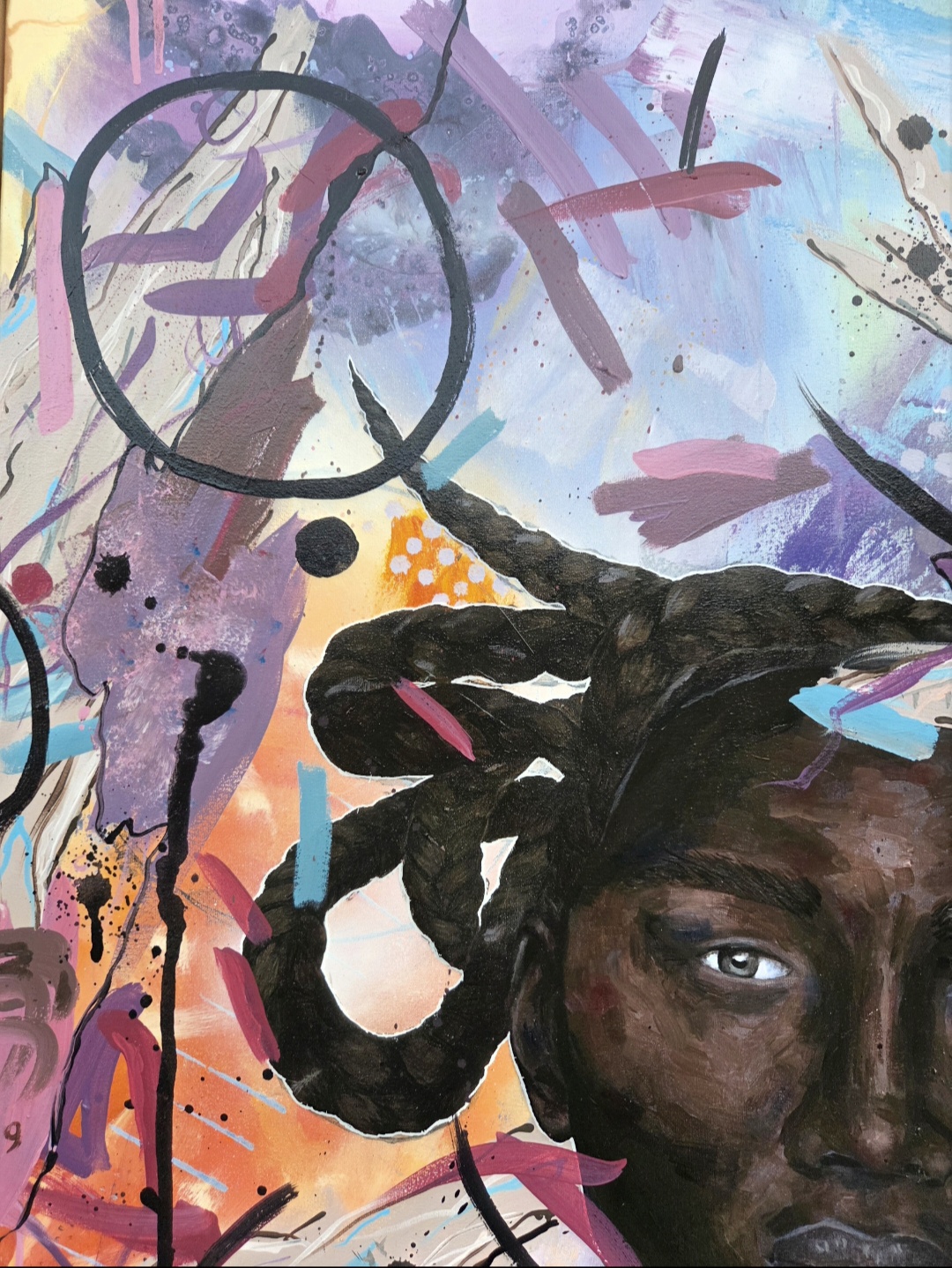 While painting Oya, the artist had a unique experience. She felt the guidance of the orisha in her painting process. The use of the symbolism in the number nine, the hair which is shaped in the form of bull horns and the use of colors all bring ode to the orisha. When she finished the painting the artist cried. Not out of sadness but because she felt the connection to Oya and she had a wave of peace flushing over her.