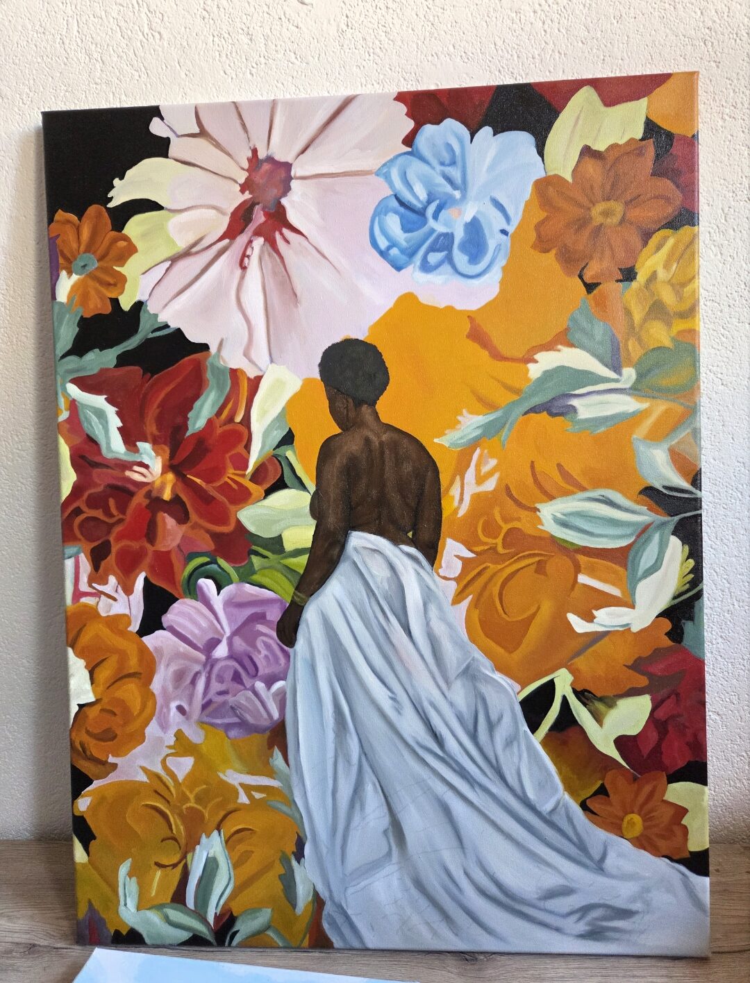 For the artist, flowers carry a double meaning. Receiving a bouquet once felt bittersweet: you were given something beautiful, yet it was already on its way to death. Their roots had been cut, just as she, having lost at a young age, felt her own grounding severed. This experience resonates more broadly with the reality many people of color face: histories uprooted, connections erased, identities forced to take root in new, uncertain soil.